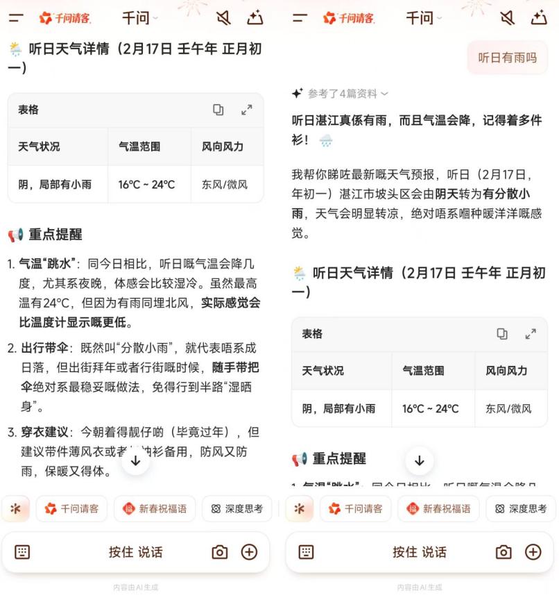 十几秒钟后,手机里一个清晰的女声用普通话将明天的天气预报读了出来,还顺带提醒了一句记得多穿衣服,这让二伯父大开眼界。要知道对于老人来说,文字输入是困难的、文字输出也是无效的,他们看不清也懒得看,但千问能读出来,而且声音没有机器感、很自然。接着二伯父又问AI:“今日有乜大事?”(今天有什么大事?)千问推过来几条新闻摘要,并且开始语音播报,老人家听得津津有味,AI一下成了他的“赛博收音机”。