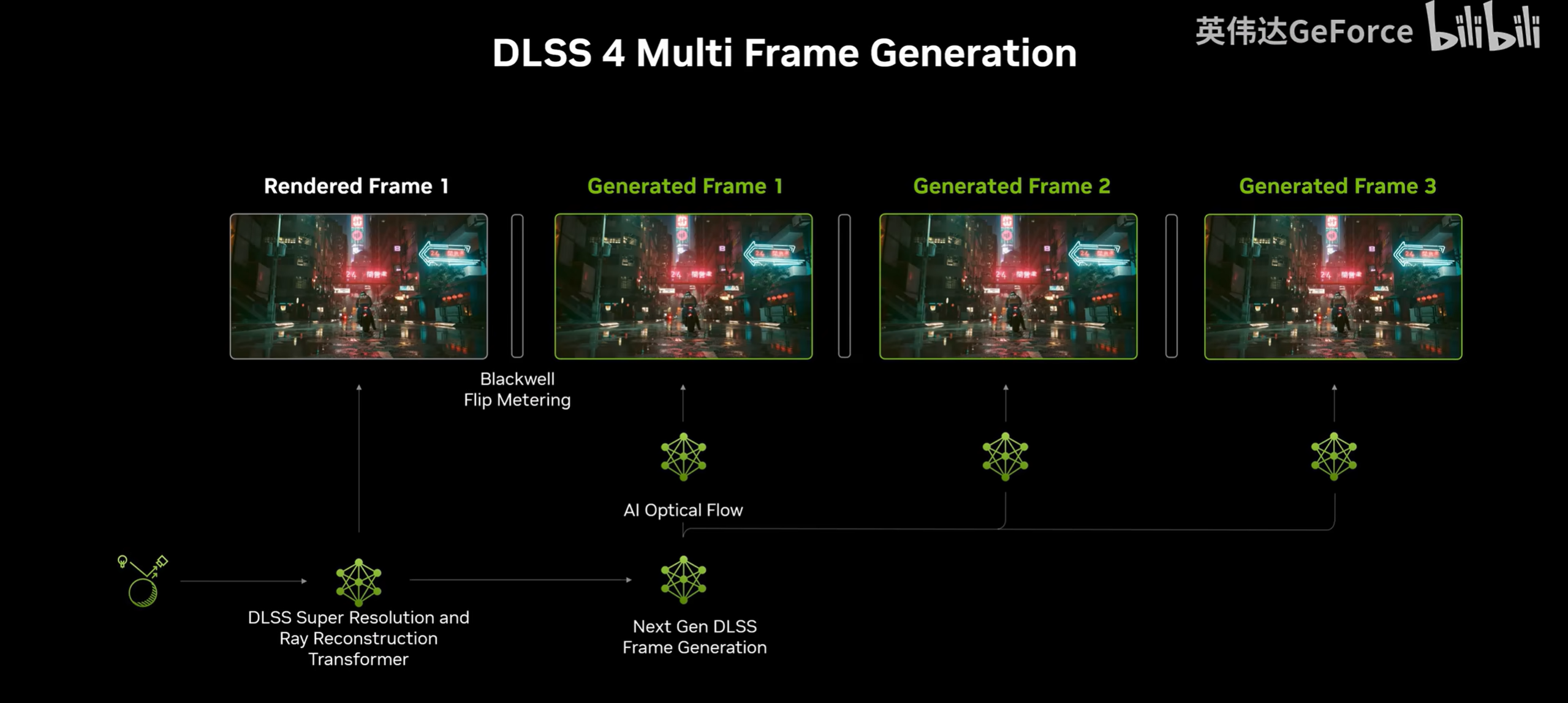 超帧方案也从原先的光流方案升级到了新的AI生成模型,不仅生成速度加快,显存占用降低,相比dlss3的方案显著降低了延迟,还支持了最多4倍的帧数倍率。