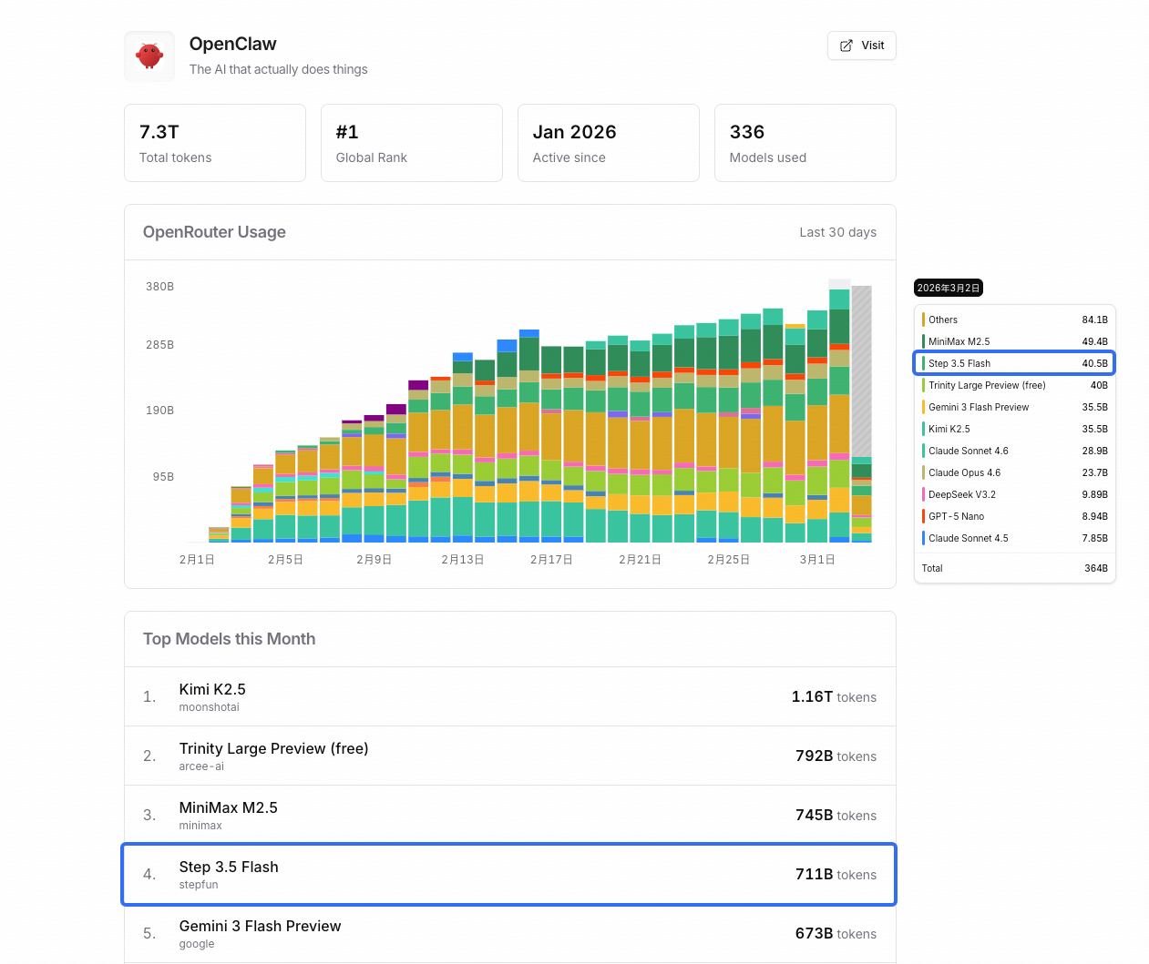 在开发者社区和实际应用中,Step 3.5 Flash 已经迅速获得了市场验证。截至目前,这款模型在 Hugging Face 上下载量已超 30 万次,并登上 OpenRouter Trending 第一名,获得了较高的社区认可度。而在知名开源项目 OpenClaw(被中国网友称为“小龙虾”)上,该模型排名已升至前二。这些成绩反映出模型在速度、稳定性和 Agent 适配性上的真实竞争力。