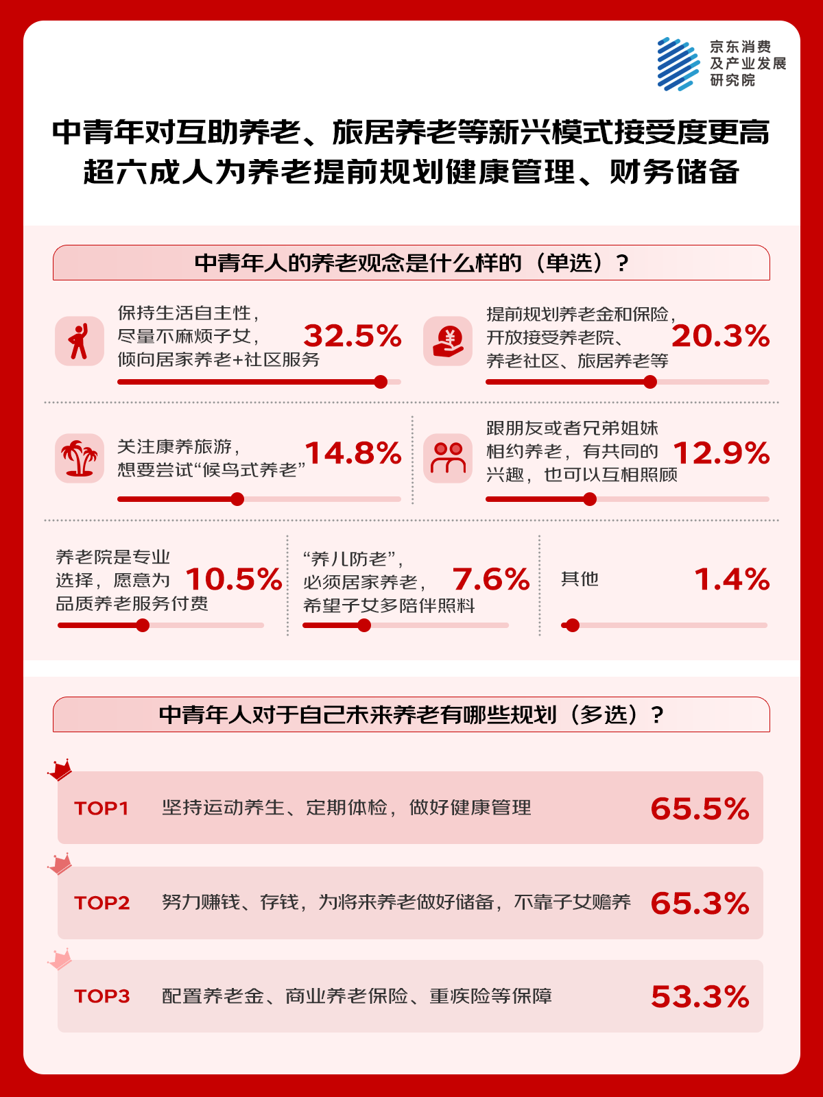 今天,我们顺着春节的“情感线索”继续深耕——当代老人们的主流养老观念究竟是“坚持传统”还是“藏着新想法”?代际之间关于养老的想法有哪些差异与共识?当下主流的居家养老模式下,究竟哪些养老服务正在被需要、亟需被满足?基于与5000个家庭深度调研得出的结果,京东消费及产业发展研究院继续梳理核心结论如下: