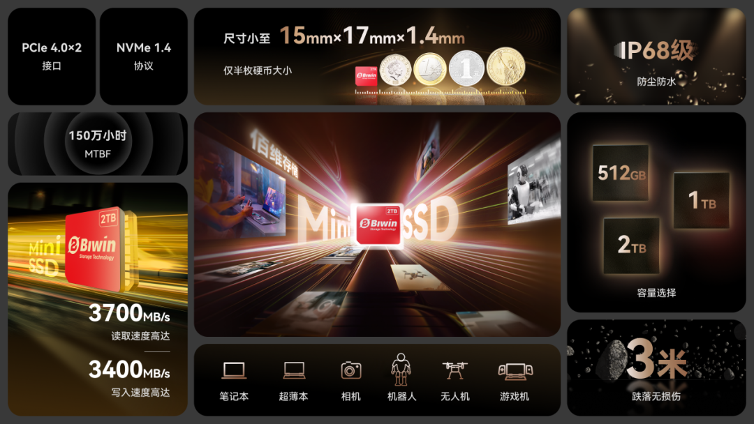 Mini SSD凭借极致小型化的尺寸(半枚硬币大小),PCIe Gen4 旗舰级性能、LGA封装带来的高抗震性,以及SIM卡式扩展设计,为笔记本、超薄本、相机、机器人、无人机、Mini PC等终端应用提供高效、创新的可扩展存储解决方案: