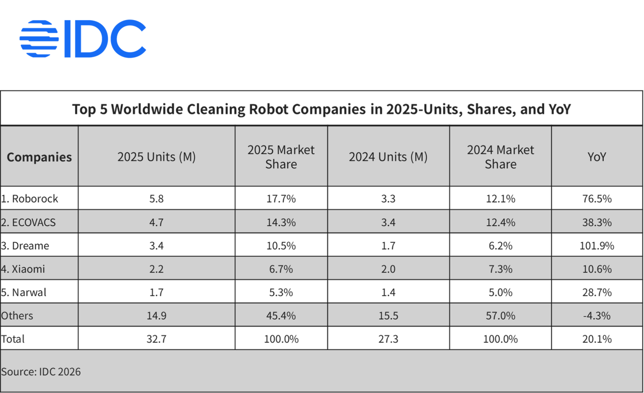 一边,是曾经扫地机器人巨头Roomba母公司iRobot申请破产保护,走向被中国供应链企业接盘的终局;另一边,是在2026年IDC最新发布的《全球智能家居设备市场追踪报告》中,石头科技(Roborock)2025年不仅继续稳坐扫地机器人全球第一,更首次登顶“家用清洁机器人品牌”榜首。