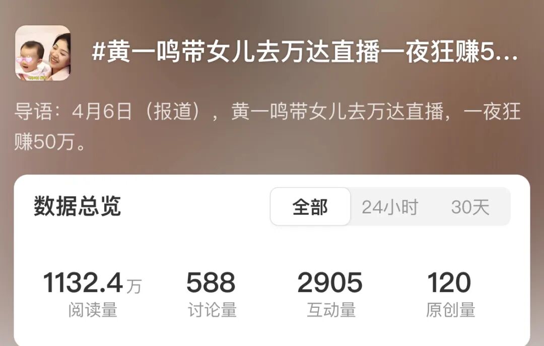 据报道,4月初,在湖州万达广场,黄一鸣带着3岁的女儿闪闪从白天播到凌晨,整整12个小时,销售额高达50万元。