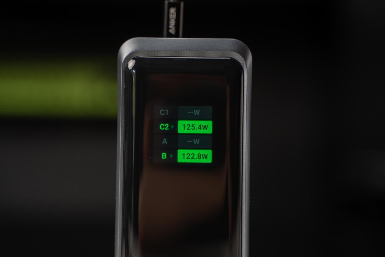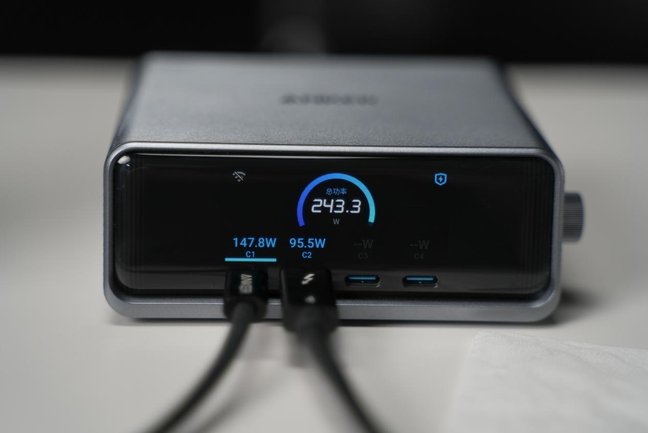 如果你觉得150W的充电速度还不够快,那么也可以再加个安克充电器,通过有线方式接入顶部的C口,最高可以让充电宝的充电功率飙到250W,13分钟就能把电量充到50%,即使临出门才想起来要充电也不耽误之后的出行。
