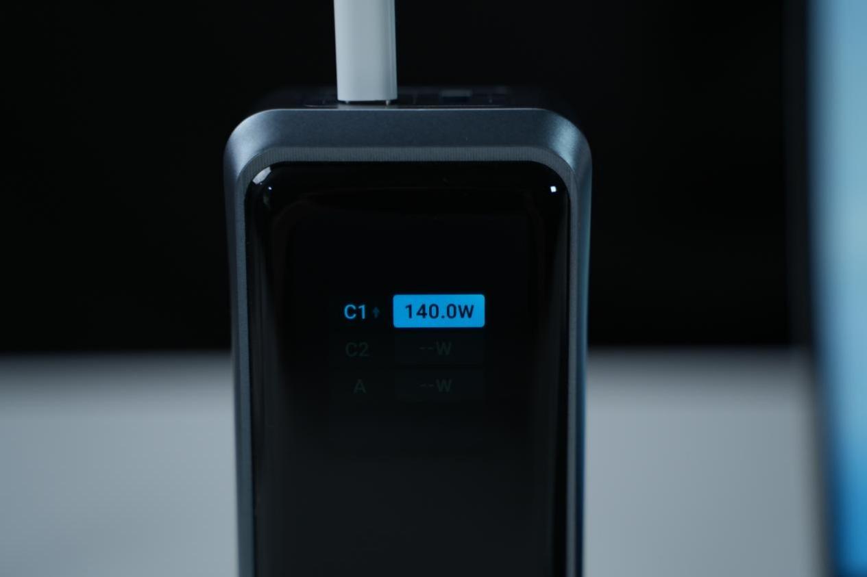 比如我插入小米设备,可以看到直接显示小米澎湃秒充的标志,并且直接拉满100W的输出功率曲线(最高支持120W)。而在接入MacBook时,则会显示单口快充,提供最高140W的PD协议输出。