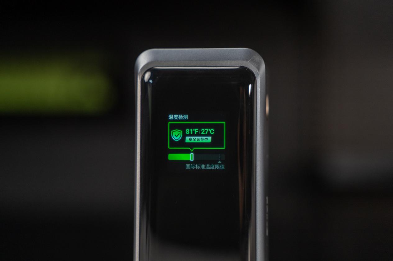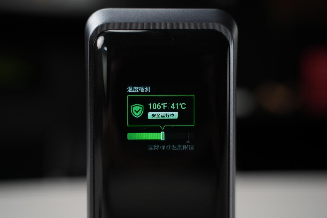 而在后续的测试中,我在已经给MacBook Pro供电的情况下又给它加了部Windows游戏本和一台手机。此时充电宝的智能分配策略开始介入,给游戏本分配了100W输出(游戏本C口供电上限),而手机则是激活了18W的快充协议,总输出功率在245W到250W之间浮动。持续十多分钟后外壳温度仅41度,离国际安全标准规定的77度上限仍有很大差距。