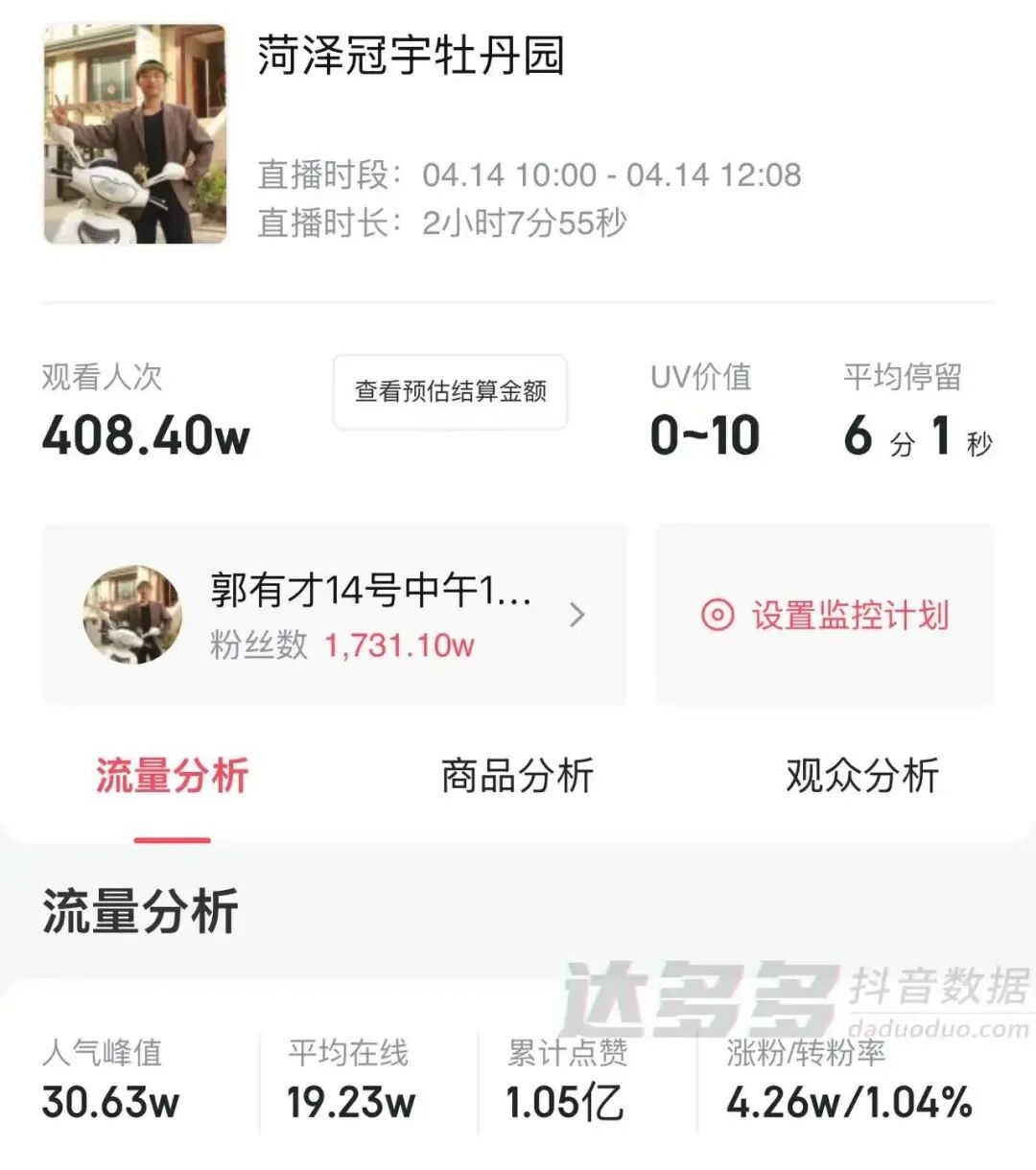 4月14日,郭有才在菏泽冠宇牡丹园直播,现场人山人海。数据显示,直播间最高同时在线人数突破10万+。据第三方数据显示,直播场观达到400+万。