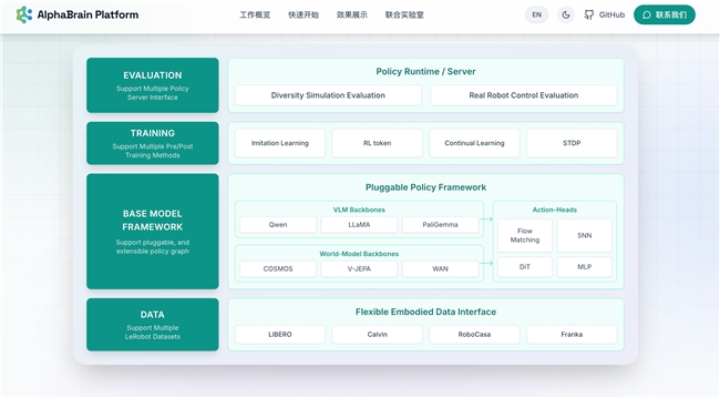 以前,开源一个模型是给你一个工具。现在,AlphaBrain Platform直接给你一个“顶配全家桶”——最前沿的模型、最趁手的工具、最标准的评测,一次配齐,开箱即用。