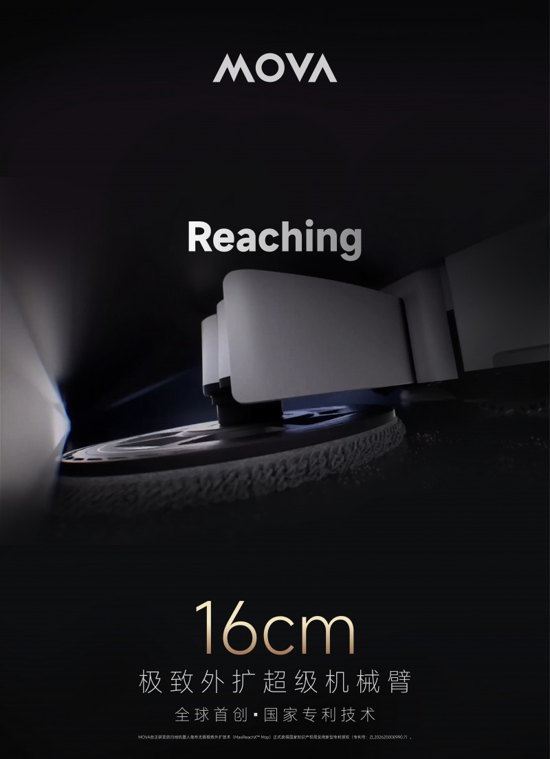 近日,全球高端创新智能家电品牌MOVA自主研发的扫地机器人拖布无极极致外扩技术(MaxiReachX™ Mop)正式获得国家知识产权局实用新型专利授权(专利号:ZL202620000990.7)。该技术以全球首创的16cm极致外扩超级机械臂为核心,首次在扫地机器人领域建立了可脱离机身限制进行地面清洁的技术路径,使扫地机器人的清洁方式从“机身进入空间”转向“清洁结构主动延伸进入空间”,让清洁单元不再受限于整机尺寸。