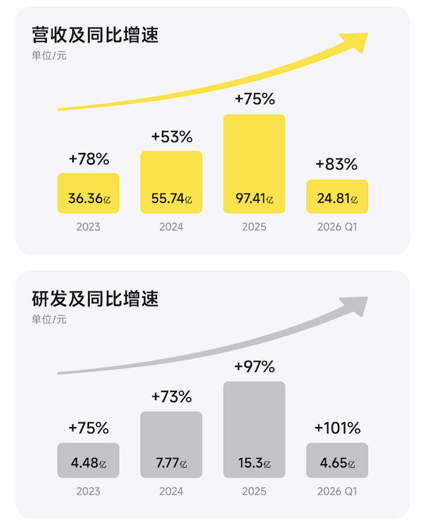 4月28日,影石创新(688775.SH)发布2025全年及2026年一季度业绩,多项核心指标达历史新高。2025年营收97.41亿元,同比增长74.76%。2026年一季度营收24.81亿元,同比增长83.11%,三年营收规模扩张近3倍,复合增长率超过63%。据悉,云台相机、无线领夹麦克风、无人机三大新品预计一年内上市,影石加速从硬件生产向影像生态构建者转型。