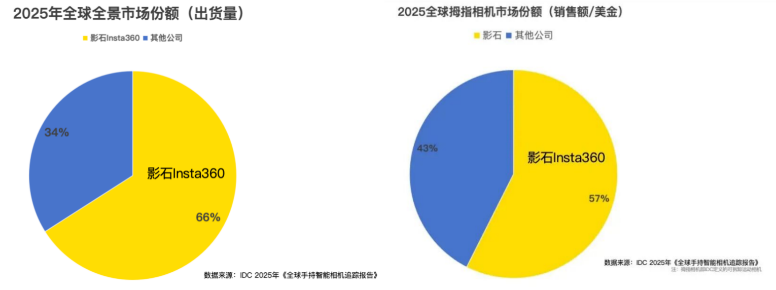 据IDC最新数据,影石在全景相机与拇指相机两大核心原创品类保持全球领先地位,市场份额分别达到66%与57%。